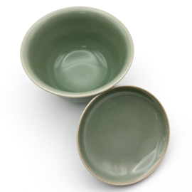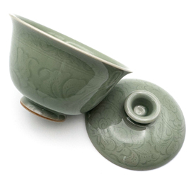 龍泉窯の劉傑大師による柴窯(薪窯)の蓋碗です。 劉傑大師は若くして中国伝統工芸大師、麗水市工芸美術大師となった非常に優秀な作家です。APECやG20、一路一帯といった国賓を迎えて行われる晩餐会で使用される食器の制作や浙江省博物館の青瓷技芸復元プロジェクトを任されるなど、龍泉窯の中でも技術の高い作家として知られています。 彼自身、お茶が好きということもあり、非常に使いやすい茶器を創り出します。美しさだけでなく、細部までこだわり抜いた精密さは使いやすく、美味しくお茶を淹れることができる稀有な作品を生み出しています。 この作品は全く欠点のない窯玉とされました。刻花による花の文様が美しく、品格のある素晴らしい作品です。 作家によっては型を使用して作品を制作することがありますが、彼の作品は基本的に型は一切使用せず、全て自らの手で作り上げています。またこの作品は柴窯(薪窯)であるため、ガスと違い、登り窯の内部全てを同じ温度で焼き上げることは不可能です。そのため1つ1つ色合いや造形は異なり、同じものは2つとありません。 作品を実際にご覧になりたい方は弊店サロン(東京都新宿区四谷)にて承ります。その場合はお問い合わせください。(ご予約制) この作品には受皿はありません。