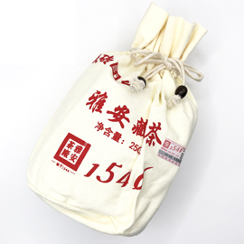散茶の形式になっていて、チベット文字の書かれた布袋に入っています。この1つで半斤(約250g)です。布袋の中は素朴な黄色いわら半紙で茶葉を包んでいます。茶葉は独特の甘い香りがあり、全体的に艶があります。